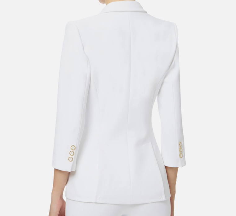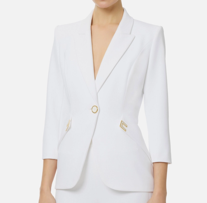 Giacca in crêpe stretch doppio strato con spalle strutturate, revers a lancia e maniche a ¾. Il blazer presenta tagli diagonali sui fianchi, impreziositi da dettagli logo in metallo dorato smaltati all'interno. Vestibilità slim