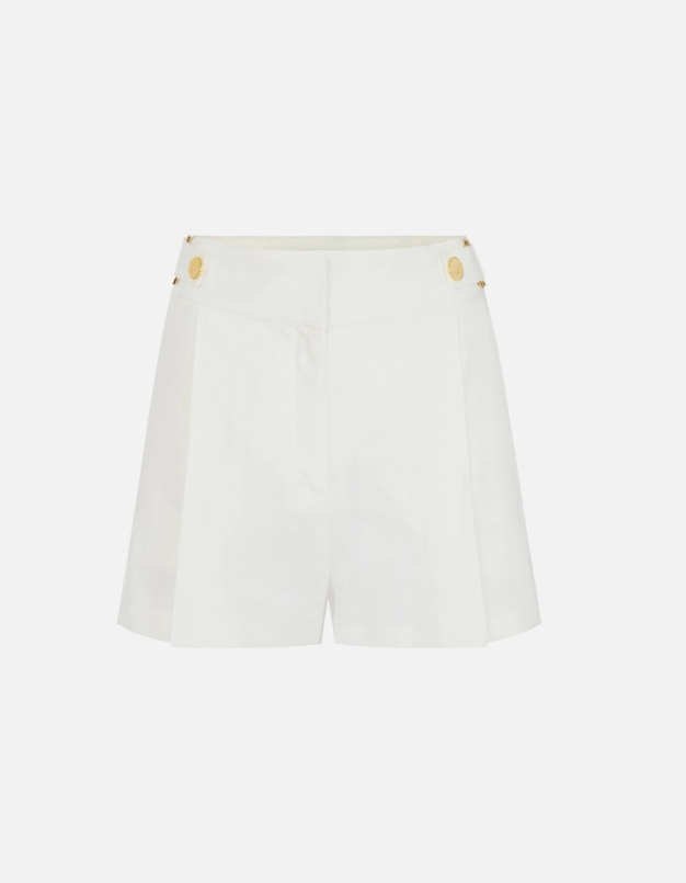 Shorts in misto lino. Presentano una costruzione a pannelli che ricrea l'effetto di una gonna. Le cinghie in vita sono decorate con anelli e bottoni in metallo dorato, per un tocco di leggerezza. Vestibilità regolare