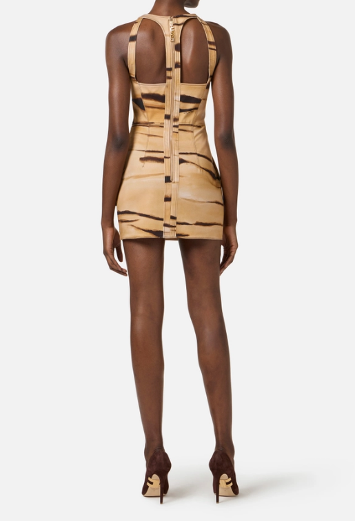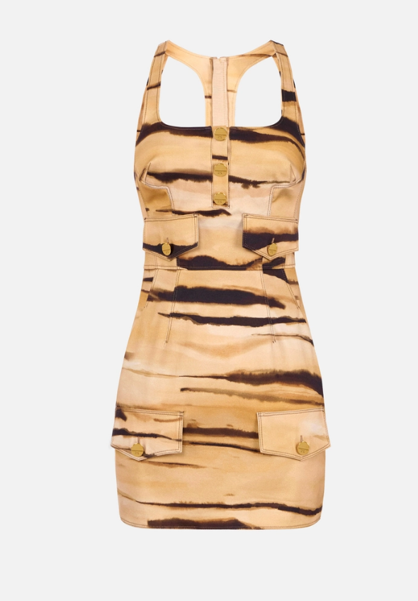 Mini abito in drill. L'abito è senza maniche e presenta un'ampia scollatura. In stile safari con tasche applicate e patte, presenta cuciture evidenziate da impunture a contrasto. Protagonista è la stampa tigre all-over, ispirata ai colori e ai motivi naturali. La schiena rivela un gioco di cut-out che lascia intravedere le spalle. Vestibilità slim