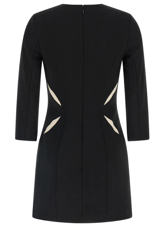 Mini abito in crêpe leggero dalla vestibilità regular. Il vestito ha girocollo e maniche 3/4. Si distingue per le aperture e i cut-out sovrapposti su tessuto bicolore, a ricreare un intarsio geometrico di ispirazione floreale. Sul busto, dettagli con logo posizionati asimmetricamente