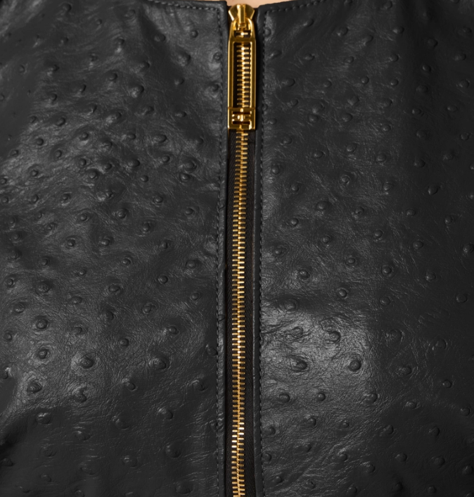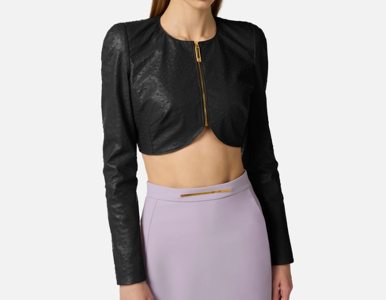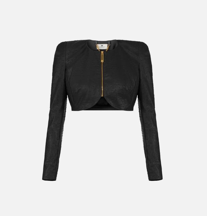 Giacca realizzata in materiale sintetico con texture effetto pelle. Presenta spalle strutturate per una silhouette decisa e taglio crop stondato sul davanti. Protagonista è la stampa con texture effetto struzzo che dona carattere e movimento. Vestibilità aderente.