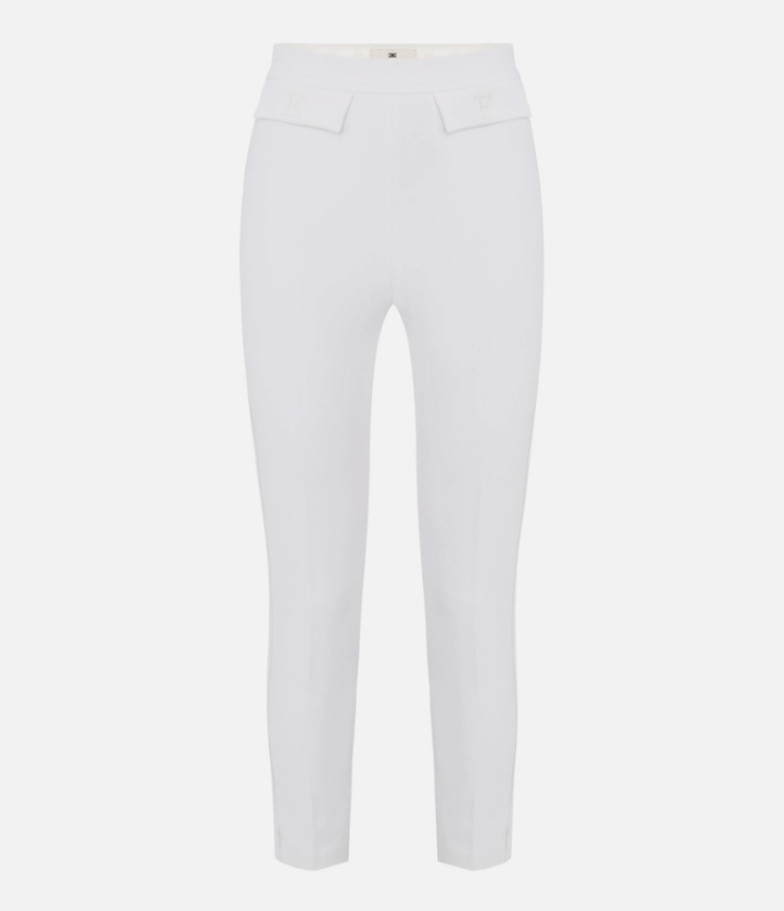 Pantaloni in doppio crêpe stretch. Hanno cuciture riportate esternamente, rifinite con tessuto a taglio vivo e impunture. Sul davanti, le patte sono impreziosite dal logo ricamato in filo e in tono. Vestibilità regular. Parte della collezione Essential, per costruire il guardaroba perfetto