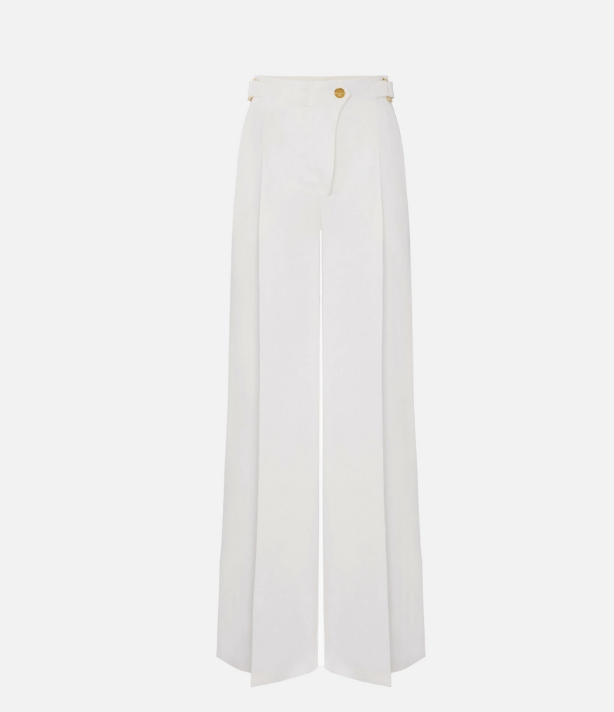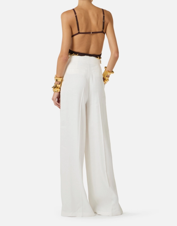 Pantaloni a vita alta in misto lino. Con ampi volumi a palazzo, hanno fascione definito da cinturini con anelle in metallo dorato per una nota luminosa. La patta con taglio diagonale è il dettaglio di stile. Vestibilità over