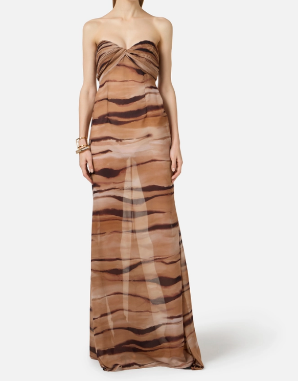 Abito da sera in chiffon dalla vestibilità slim. Il vestito ha spalle scoperte e busto con coppe drappeggiate. Protagonista è la stampa all-over a tema tigre, ispirata a colori e fantasie naturali. Il retro ha struttura a fascia che lascia la schiena nuda, la linea a sirena regala un impatto scenografico