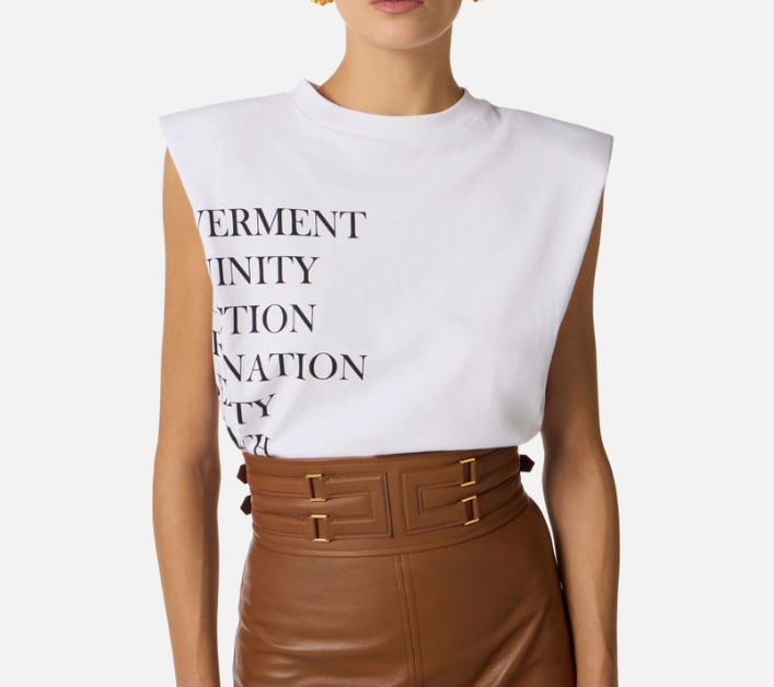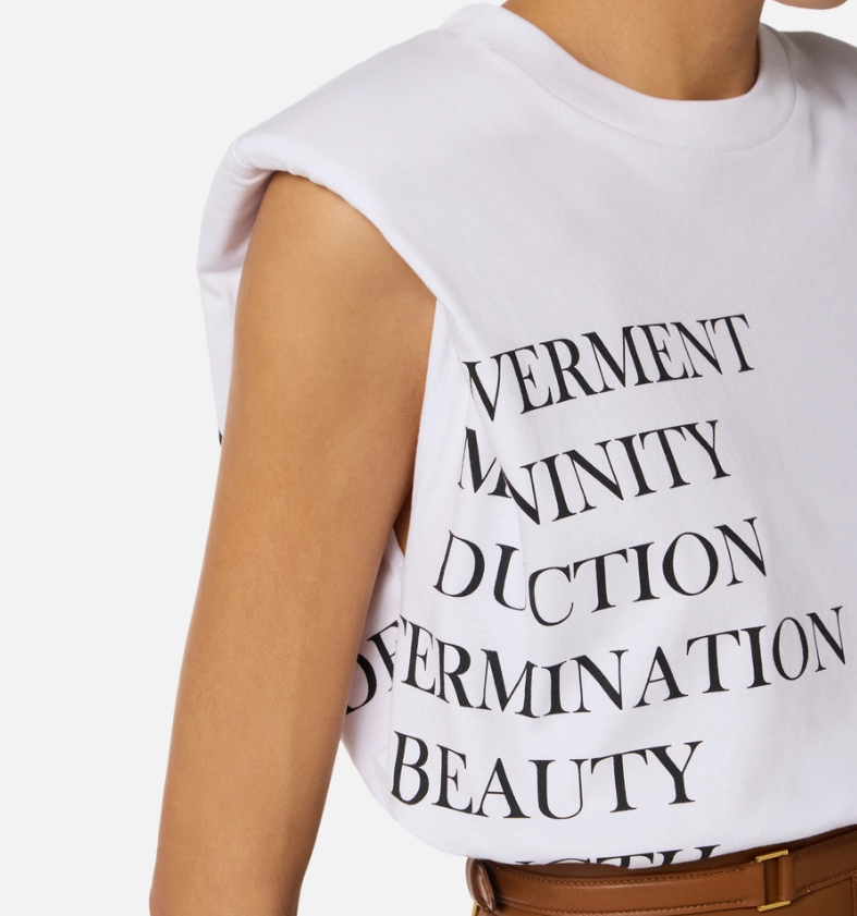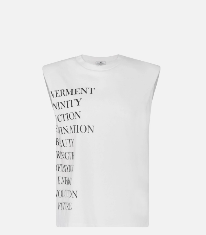 Maglietta in jersey. È smanicata con spalle strutturate e ha girocollo. Protagonista è la stampa lettering sul davanti, in colore a contrasto per un deciso impatto grafico. Vestibilità regular