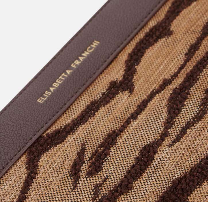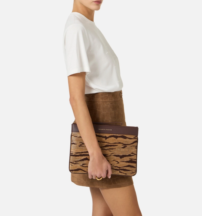 Busta realizzata in tessuto con texture effetto rafia. Protagonista è la stampa all-over a tema tigre, ispirata a colori e forme naturali. Chiusura con zip