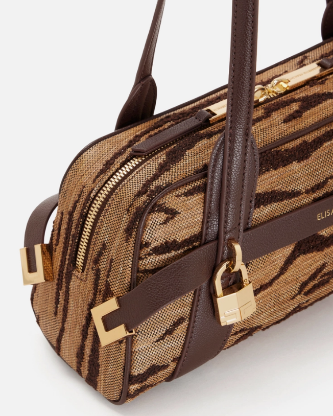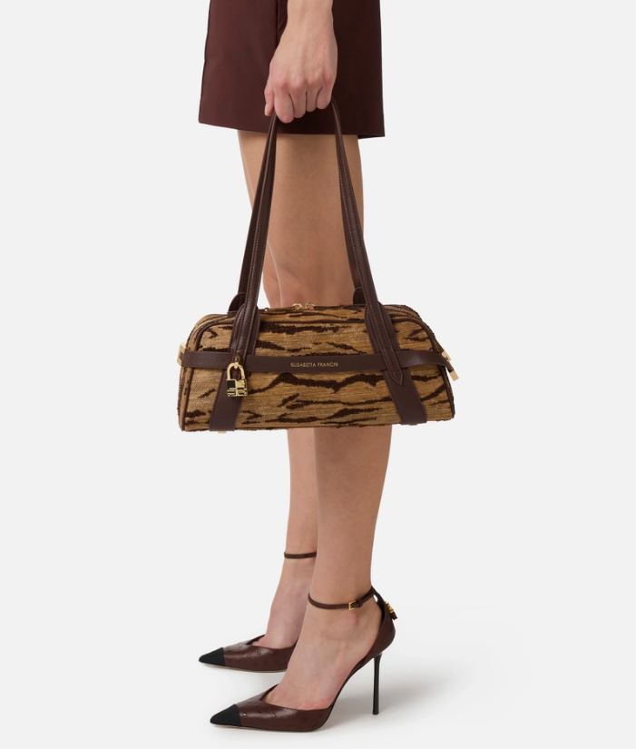 Borsa bauletto realizzata in tessuto con texture effetto rafia. L'accessorio ha manici regolari ed è impreziosito su un lato dal lucchetto gioiello in metallo dorato. Protagonista è la stampa all-over a tema tigre, ispirata a colori e forme naturali