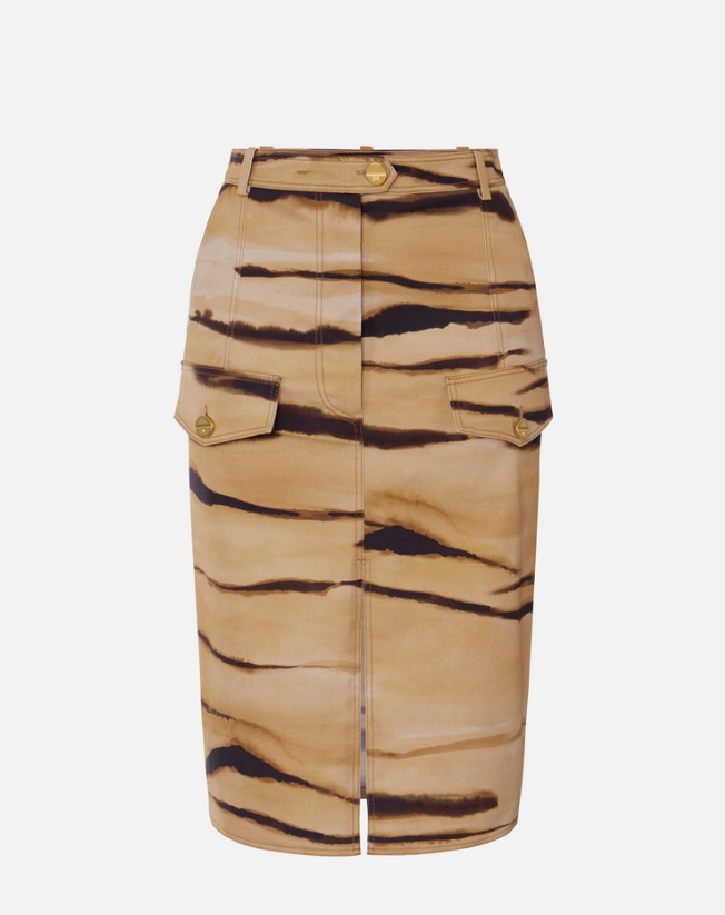 Gonna in drill. In stile safari con patte applicate, ha cuciture evidenziate da impunture a contrasto. Protagonista è la stampa all-over a tema tigre, ispirata a colori e fantasie naturali. I bottoni in metallo dorato aggiungono note luminose. Vestibilità aderente