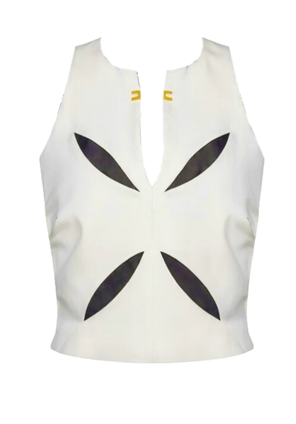 Top in crêpe leggero smanicato. Ha girocollo con apertura a V. Si distingue per i cut-out sovrapposti su tessuto bicolore, a ricreare un intarsio geometrico di ispirazione floreale. I dettagli con logo in metallo dorato illuminano lo scollo. Vestibilità aderente.