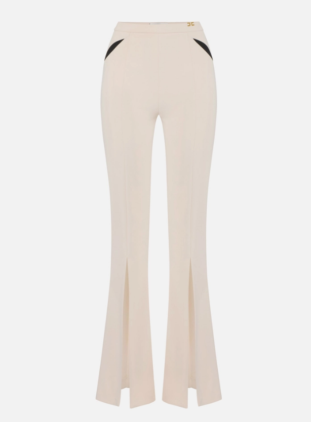 Pantaloni in crêpe leggero. I fianchi sono definiti dai cut-out sovrapposti su tessuto bicolore, a ricreare un intarsio geometrico. Sulla vita brilla un dettaglio con logo in metallo dorato. Gli spacchi al fondo slanciano la figura e regalano una silhouette decisa. Vestibilità aderente