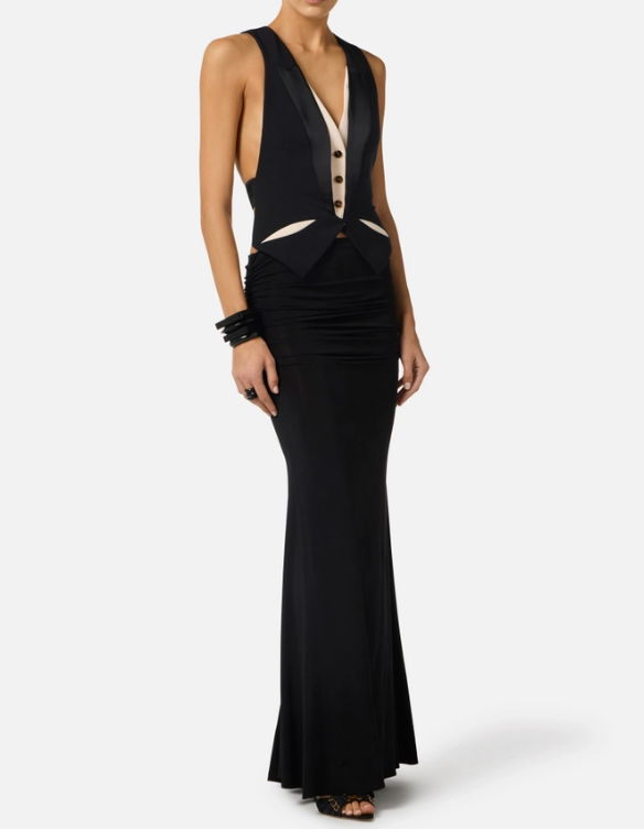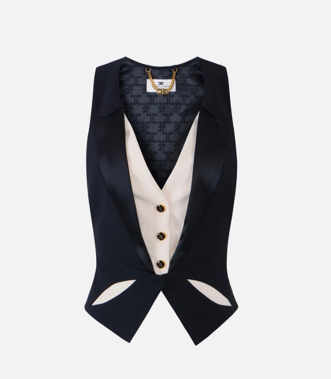 Gilet in crêpe leggero con rever realizzati in raso, per un raffinato contrasto di texture. I cut-out bicolore ricreano un motivo geometrico e sono replicati sul retro. La fascia elastica in vita disegna una silhouette decisa. Vestibilità aderente.