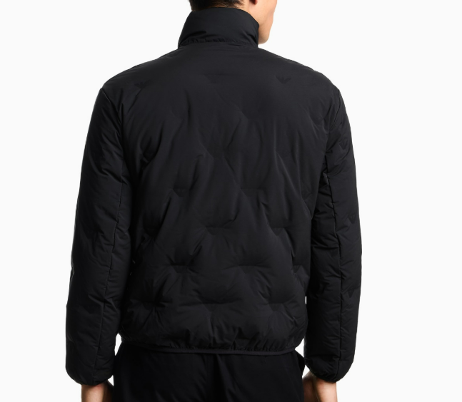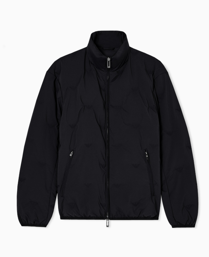 Piumino provvisto di chiusura full zip, realizzato in nylon e decorato da esclusivo intarsio con micro aquile in tono che donano un leggero effetto trapuntato