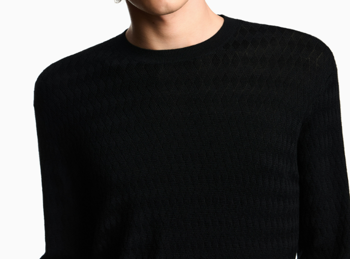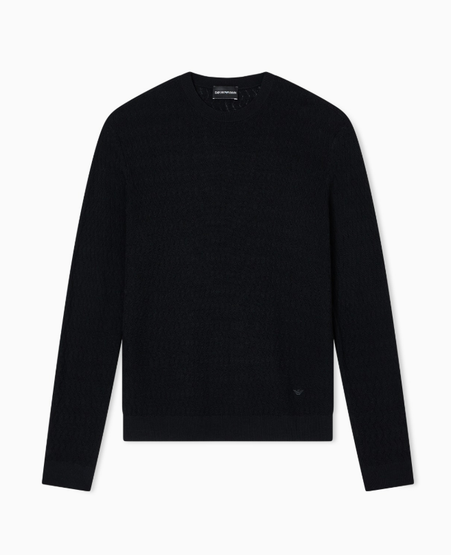 Maglione girocollo realizzato in pura lana vergine dalla texture particolarmente materica, percorso da pattern a rilievo a lavorazione jacquard che crea una naturale intersezione di motivi strutturati e ricercati all over.