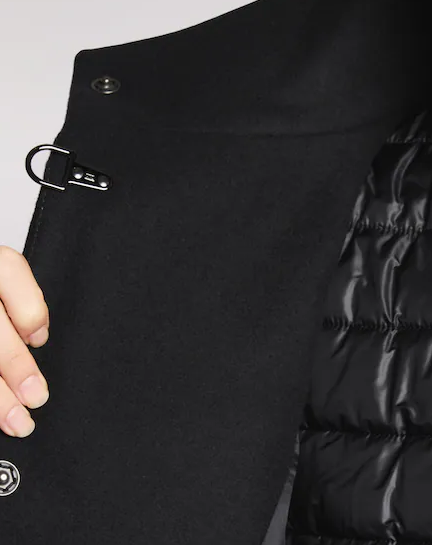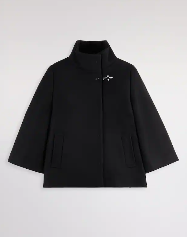 Linee geometriche e costruzione essenziale definiscono questa cappa, che riprende l'ampio collo avvolgente dell'iconico cappotto Virginia. Caratterizzata da maniche a tre quarti e gancio Fay, è realizzata in panno misto lana, con tasche a filo laterali e chiusura con automatici nascosti