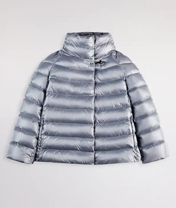Questa versione, in nylon leggero downproof e idrorepellente, presenta un'imbottitura in piuma trapuntata a righe. Dotata di maniche raglan e una chiusura con zip, automatici invisibili e l'iconico gancio Fay all'altezza del collo, è completata da tasche a filo laterali chiuse con zip.