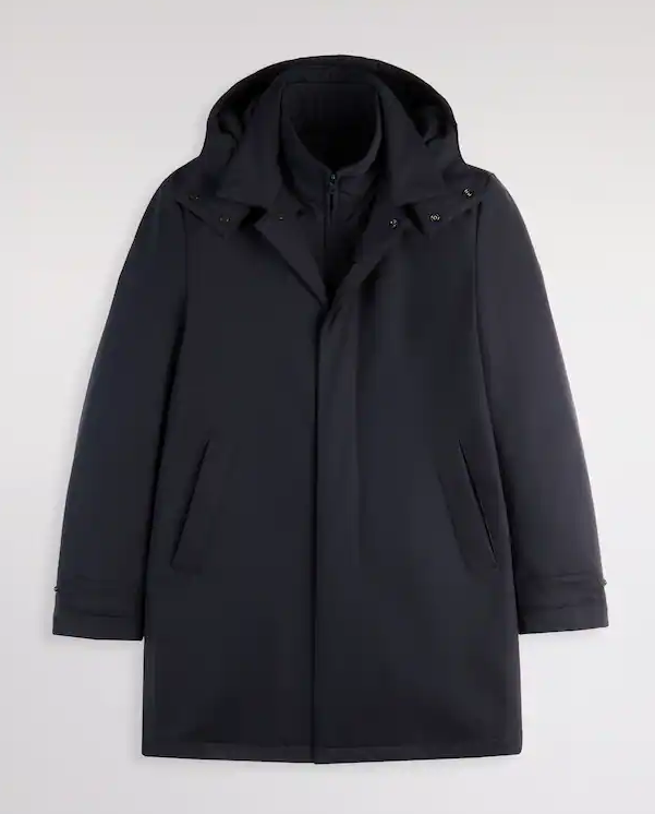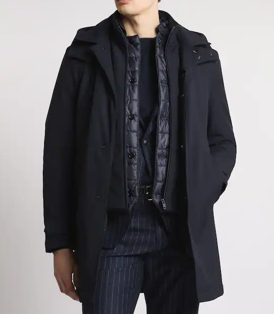 Morning Coat travel realizzato in jersey stretch con trattamento antigoccia e cappuccio removibile. Il modello, imbottito in ovatta stretch, è dotato di alamari su fondo manica, tasche a filetto e una chiusura con zip e automatici nascosti. Completano il capo una pratica tasca interna e l'etichetta Fay Travel.