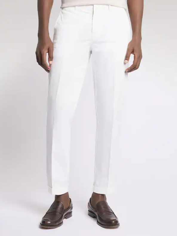 Pantaloni capri slim fit in gabardine stretch tinti in capo, con fondo risvoltato. Caratterizzati da tasche anteriori oblique, taschino portamonete e tasche posteriori a filetto con bottone, presentano una chiusura con zip e bottone. Il modello è arricchito dall'etichetta personalizzata Fay sul retro e un fondo risvoltato.
