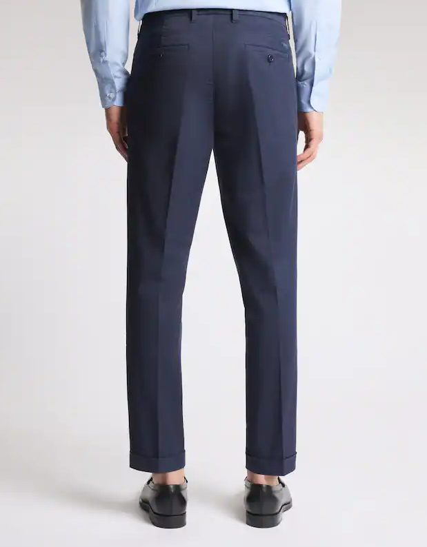 Pantaloni capri slim fit in gabardine stretch tinti in capo, con fondo risvoltato. Caratterizzati da tasche anteriori oblique, taschino portamonete e tasche posteriori a filetto con bottone, presentano una chiusura con zip e bottone. Il modello è arricchito dall'etichetta personalizzata Fay sul retro e un fondo risvoltato.