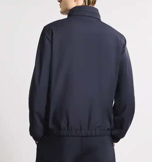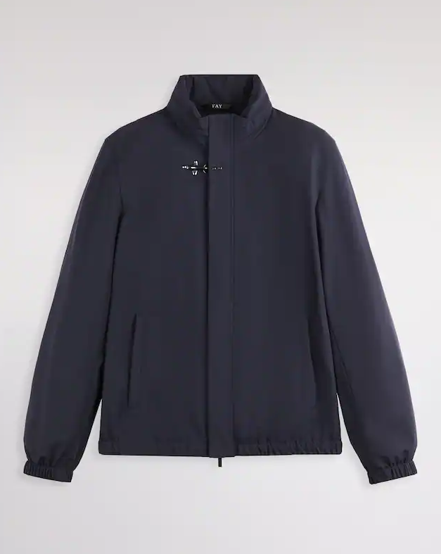 Bomber Travel foderato realizzato in nylon stretch con trattamento antigoccia. Dotato di un collo in piedi con cappuccio estraibile, presenta un fondo e polsi con elastico. Chiuso con zip, bottoni automatici e l'iconico gancio all'altezza del collo, ha le tasche a filetto con zip. Il modello è completato da una pratica tasca interna