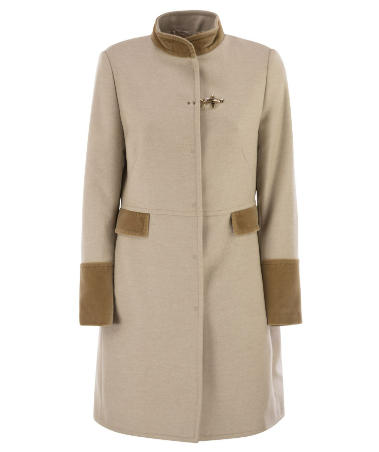 Dotato di un collo avvolgente e morbidi dettagli in velluto, è impreziosito da una chiusura con iconico gancio Fay e bottoni nascosti. Realizzato in morbido panno misto lana, è completato da tasche con pattina.