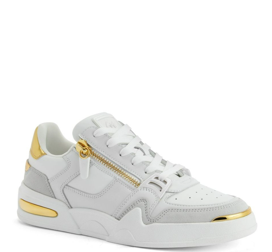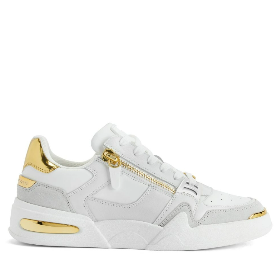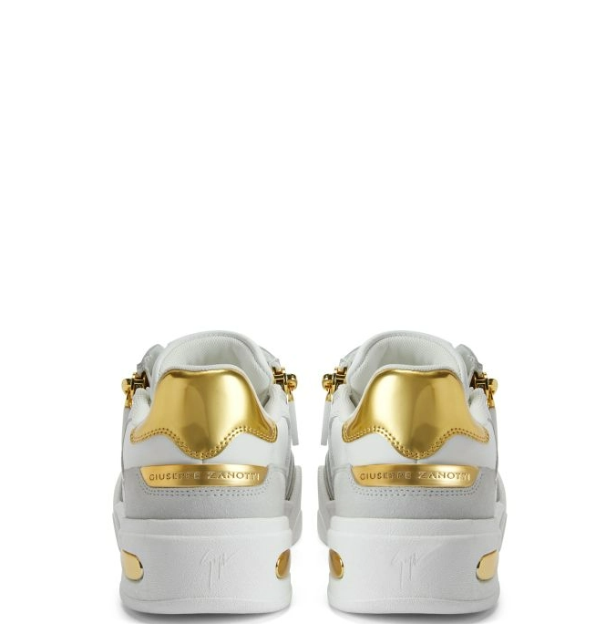 Sneaker low-top allacciata bimateriale in pelle e camoscio con doppia zip laterale e suola in gomma.