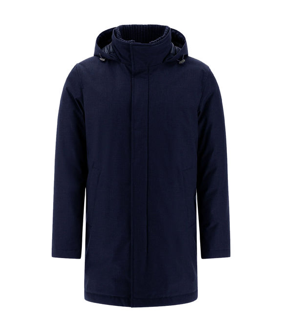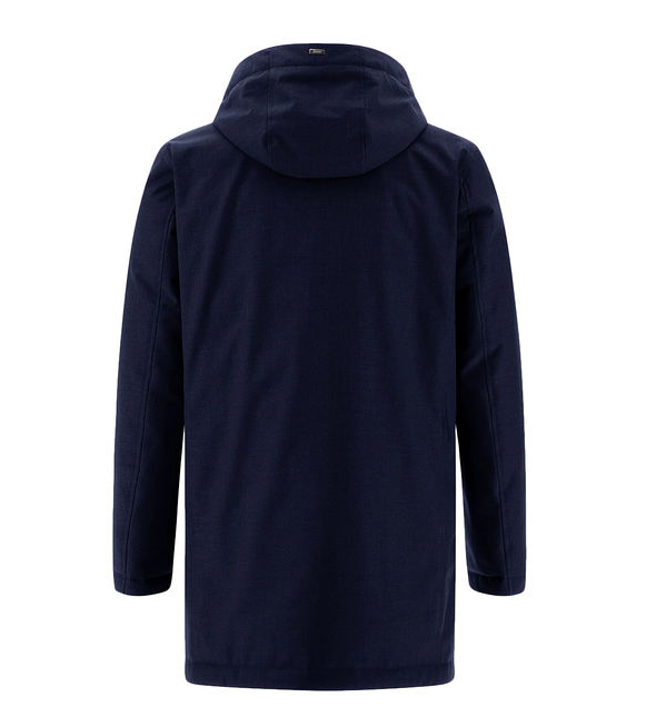 Giaccone in tessuto tecnico trattato con membrana super light traspirante e antivento. Presenta cappuccio con coulisse e zip a doppio cursore. Imbottitura in piuma d'oca.
