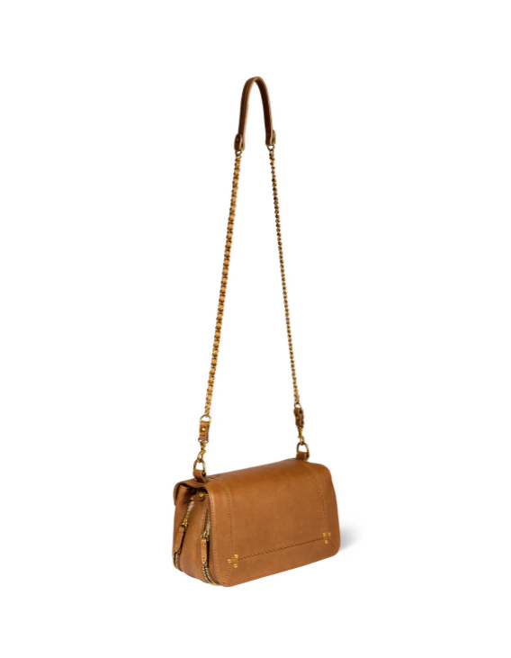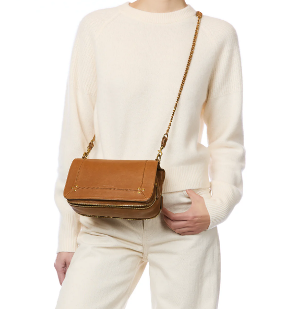 Tracolla in pelle e catena regolabile e due lunghezze: 65 cm o 105 cm. Patta in pelle con doppia chiusura magnetica. Tre scomparti a marsupio. Due soffietti con cerniera per regolare la dimensione. Uno specchio staccabile e un gancio portachiavi all'interno