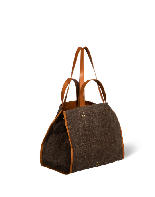 Chiusura con linguette in pelle a pressione. Quattro manici, di due lunghezze, in pelle sulla parte superiore della borsa. Borsa organizzata con un ampio scomparto e una pochette in pelle appesa tramite un anello all'interno