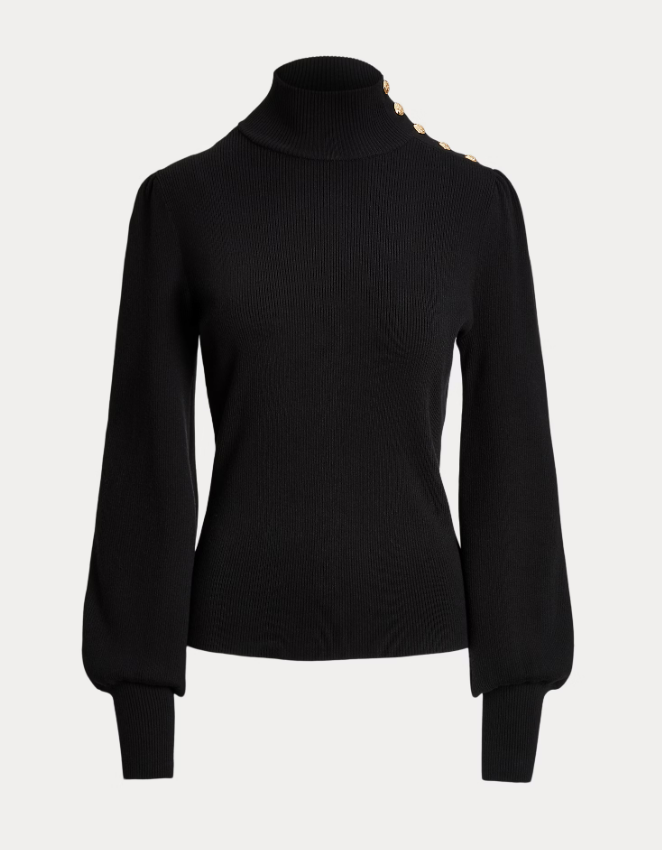 Bottoni con stemma goffrato e maniche lunghe a sbuffo esaltano l'eleganza di questa maglia a coste con collo a lupetto, realizzata in morbido misto cotone.