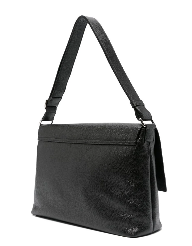 Tracolla nera di Orciani, risvolto con chiusura magnetica, tasca frontale con zip, tracolla regolabile.