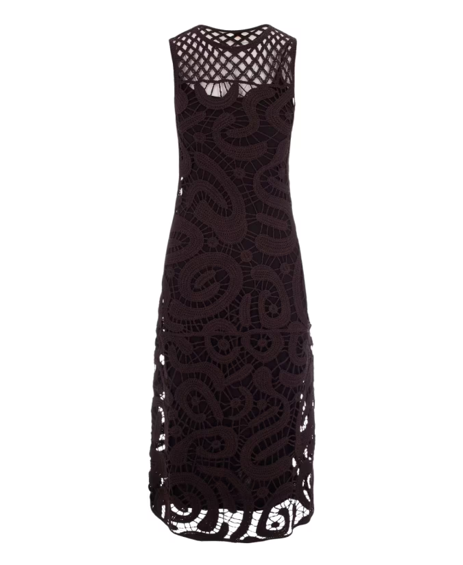 Abito midi con girocollo e design smanicato, caratterizzato da uno strato superiore con raffinata lavorazione crochet dall'innovativo motivo geometrico che, grazie alla sottoveste interna tinta unita