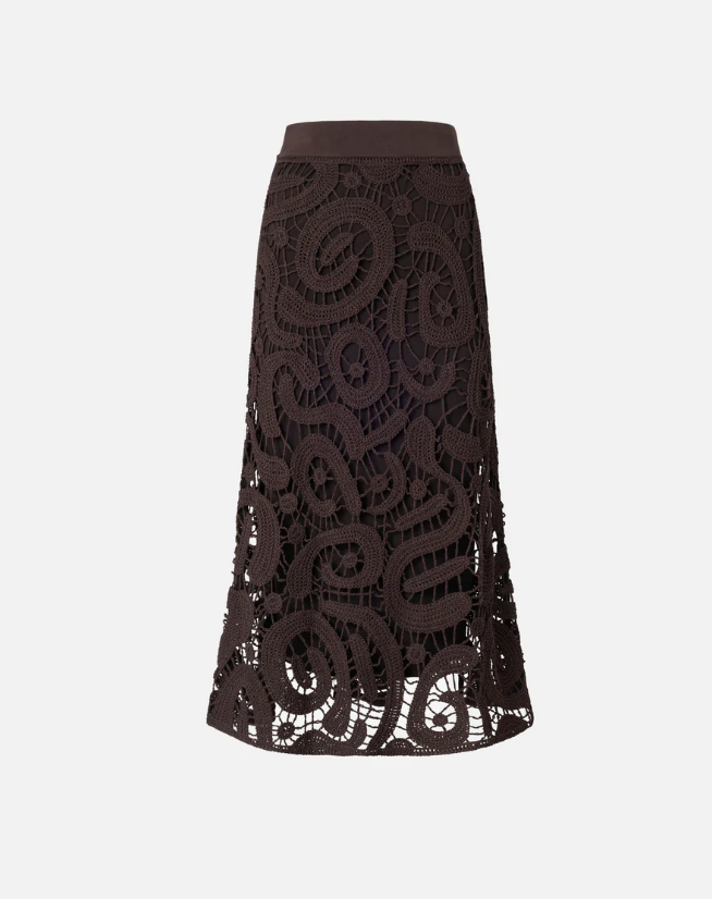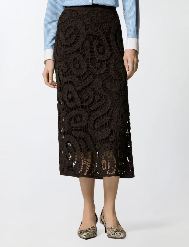Gonna con lunghezza midi e linea svasata al fondo, dotata di vita elasticizzata e caratterizzata da una raffinata lavorazione crochet con un innovativo motivo geometrico