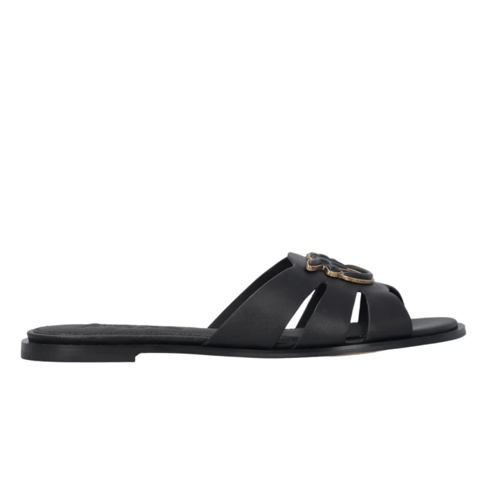 Realizzata in pelle con costruzione flat e linea pulita. La fascia superiore presenta intagli laterali con il logo applicato in metallo con finitura a contrasto sulla parte frontale