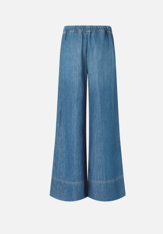 Realizzato in denim di misto cotone e lino con trattamento stone wash. Chiusura tramite cerniera invisibile sul fianco, vita elasticizzata sul retro, tasche laterali. Vita regular, gamba ampia, wide leg fit