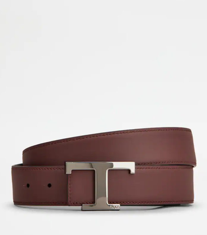 Cintura reversibile in raffinato pellame, con fibbia T Timeless in metallo personalizzato. Un lato con finitura spazzolata semilucida, un lato con finitura satinata.