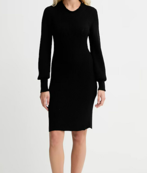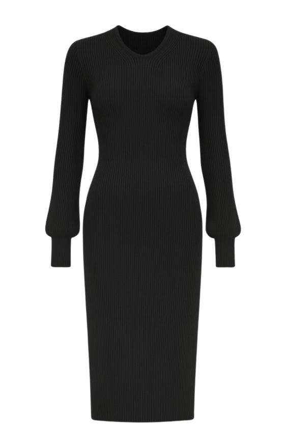 Realizzato in filato a costine elasticizzato, avvolge delicatamente la silhouette valorizzandone le forme senza costrizioni. Il design presenta scollo rotondo, maniche lunghe con polsini alti e linea dritta che scende al ginocchio
