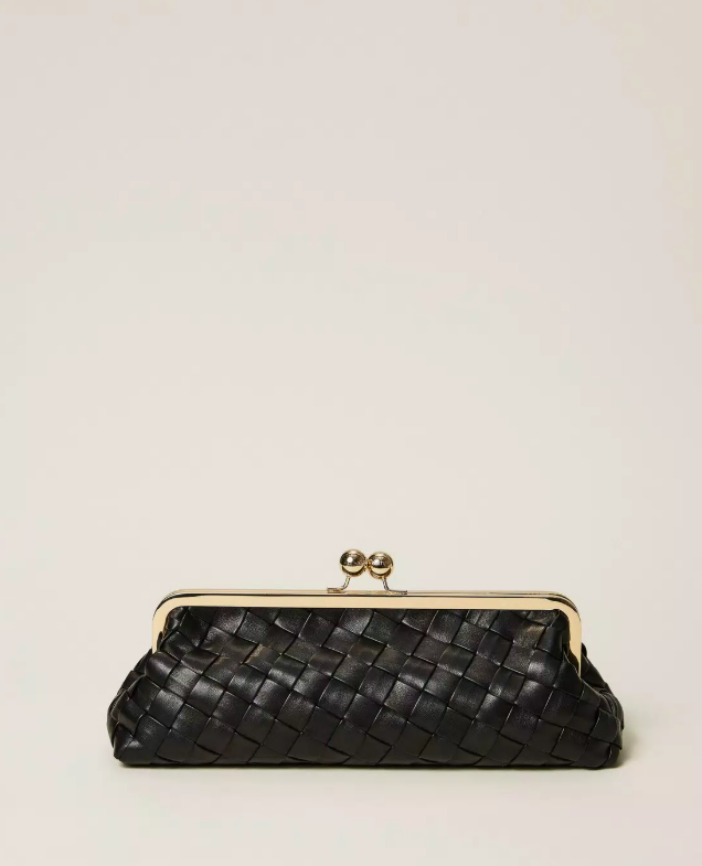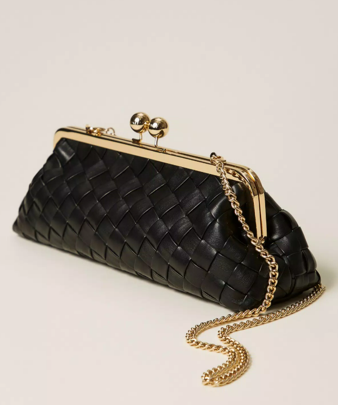 Pochette in nappa di agnello sintetico con strisce intrecciate a mano. Chiusura con cerniera in metallo e bottone a pressione con sfera in metallo logato, tracolla a catena in metallo rimovibile, fodera.