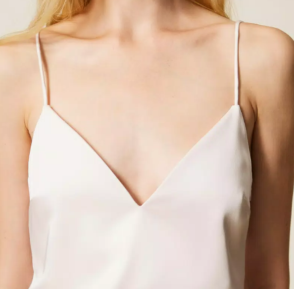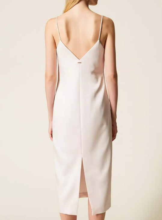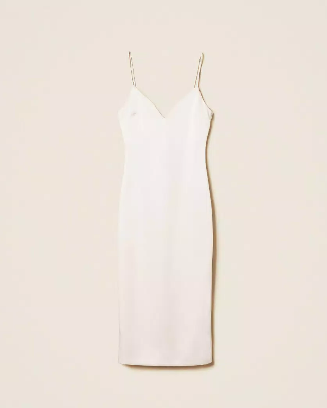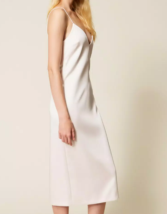 Abito lungo in duchesse con spalline, scollo a cuore davanti e a V sul retro, spalline sottili, chiusura con zip al fianco, spacco al fondo sul retro, linea dritta