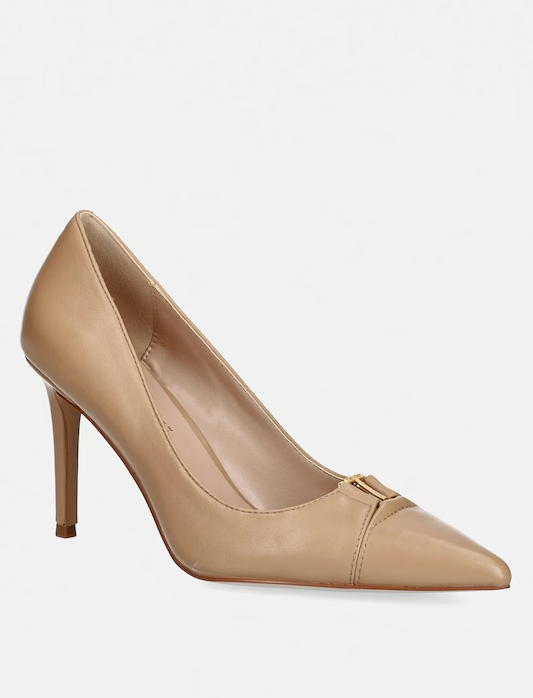 Décolleté in pelle di vitello con punta affusolata, logo in metallo, tacco a spillo e suola in tunit. Altezza tacco 9 cm