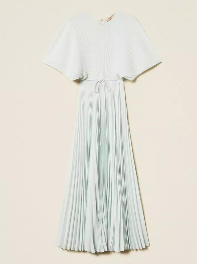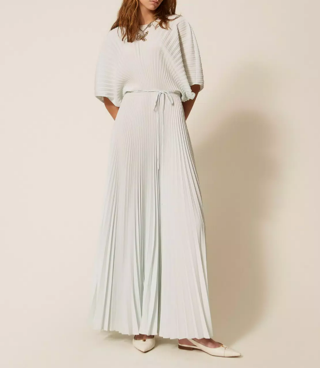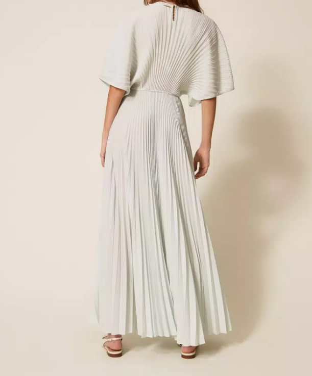 Abito lungo in crêpe de Chine (100% poliestere riciclato post consumo certificato) con lavorazione plissé. Ha collo tondo, maniche a tre quarti, taglio in vita, apertura a goccia con bottone sul retro, chiusura con zip al fianco, linea morbida. Eventuali microimpurità sono proprie dei materiali riciclati.