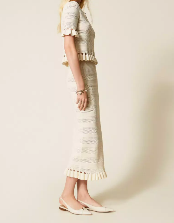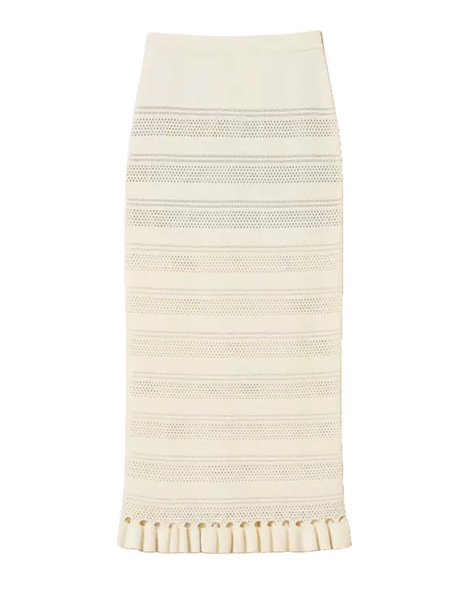 Gonna longuette in filato di viscosa crêpe con lavorazione rasata alternata a punzonature e punto rete che creano righe orizzontali. Ha elastico in vita, fondo rifinito da piccola balza effetto volant, linea fitted