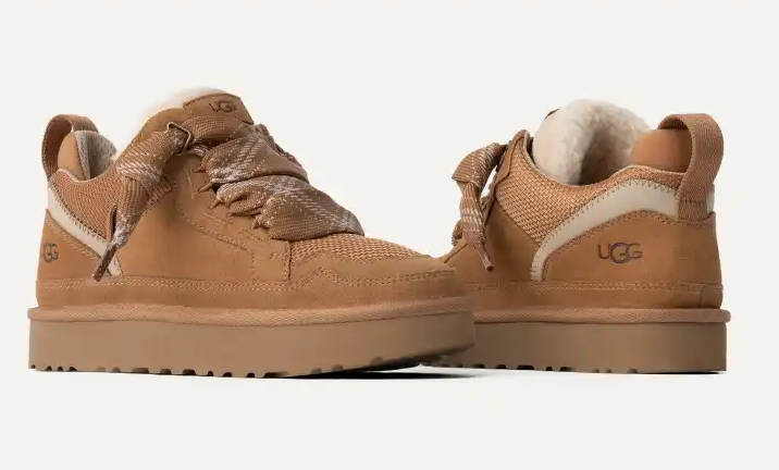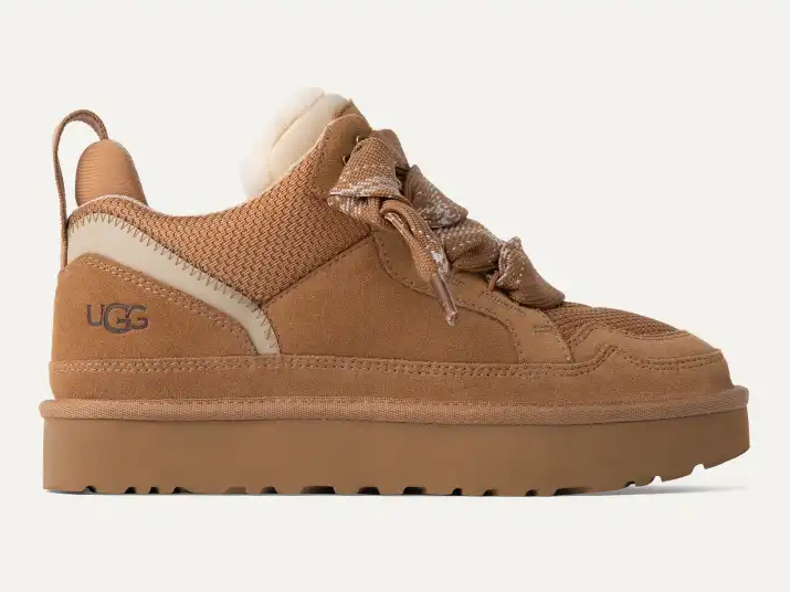 Tomaia in rete di tela intrecciata riciclata e camoscio, cinturino sul tallone in tessuto resistente, applicazione con logo UGG®, collarino imbottito, linguetta oversize imbottita