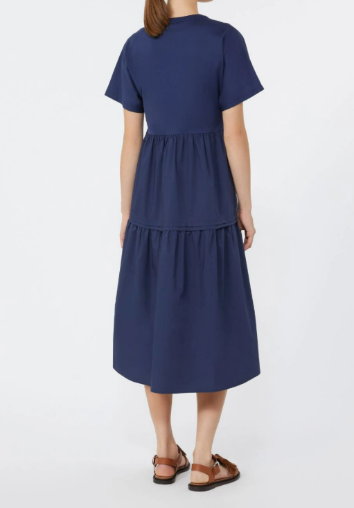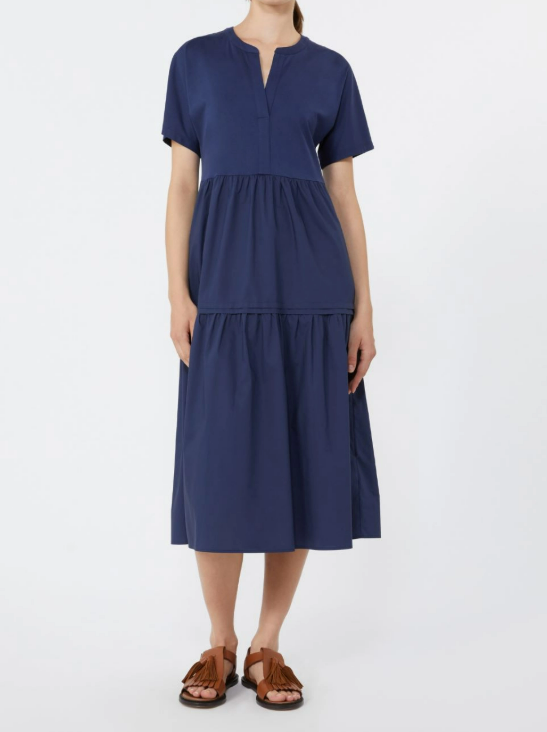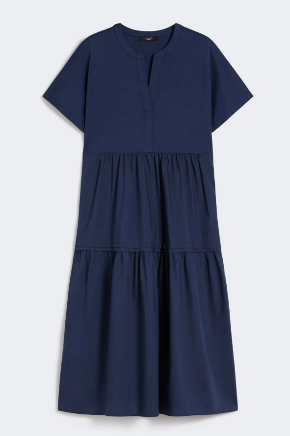 Abito midi dalla linea ampia, caratterizzato da balza sul fondo e taglio arricciato in vita