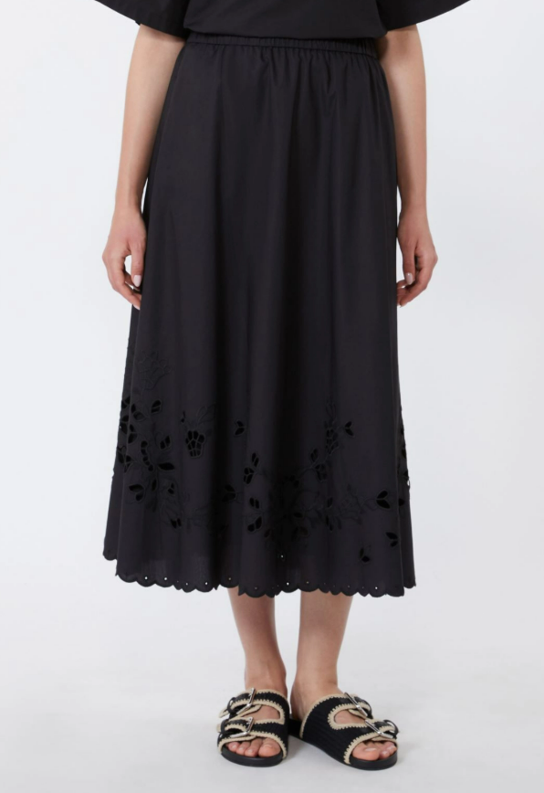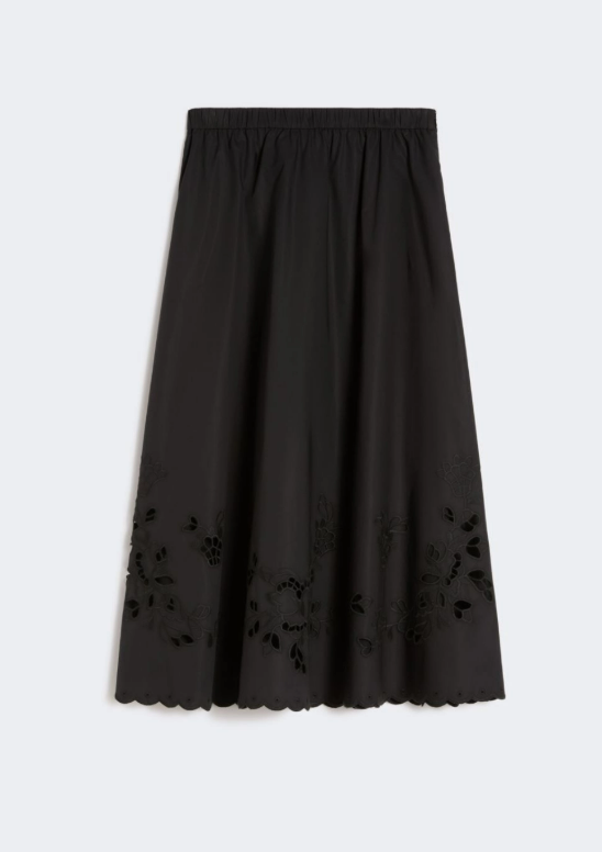 Gonna midi dalla silhouette ampia e leggermente svasata, rifinita da dettagli ricamati à jour