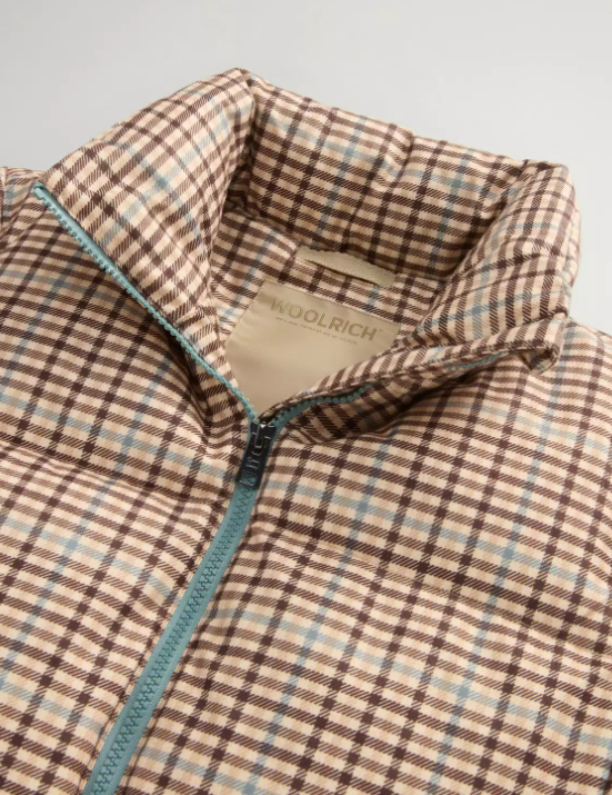 Questo piumino è realizzato in un tessuto a doppio strato, imbottito con piuma d’anatra e trapuntato per mantenere il calore corporeo. Il design include collo alto per una protezione extra, una pratica zip bidirezionale e polsini elasticizzati che assicurano comfort. Il capo è rifinito con etichetta laterale e una targhetta in metallo con il logo Woolrich.