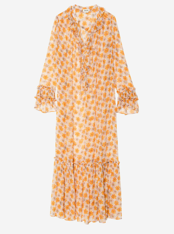 Abito lungo drappeggiato in chiffon stampato, maniche lunghe